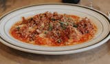 Potato dumpling topped with meat sauce and melted mozzarella.