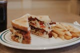 Topped with fresh lettuce, tomato, mayo, raw onion, and pickles served with a side of fries